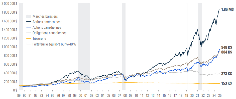 Source : Morningstar Direct, au 31 décembre 2025. Les rendements sont ajustés à l’inflation sur une base mensuelle selon l’indice des prix à la consommation (IPC) pour le Canada. Les actions américaines sont représentées par l’indice à rendement total S&P 500 en $ US; les actions canadiennes sont représentées par l’indice composé à rendement total S&P/TSX; les obligations canadiennes sont représentées par l’indice des obligations universelles FTSE Canada; le portefeuille équilibré 60 %/40 % est représenté par 30 % de l’indice à rendement total S&P 500, 30 % de l’indice composé à rendement total S&P/TSX, 40 % de l’indice des obligations universelles FTSE Canada; la trésorerie est représentée par l’indice des bons du Trésor à 91 jours FTSE.